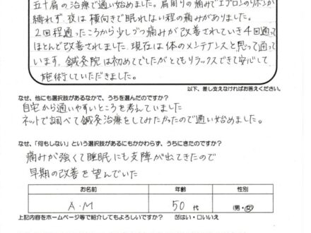 当院では鍼灸治療によって痛みの原因の大半を占める深層筋の硬さを改善する事と同時に、日々ご自宅で行って頂けるケアのご指導も行っております。