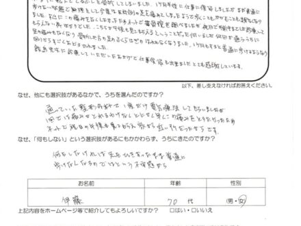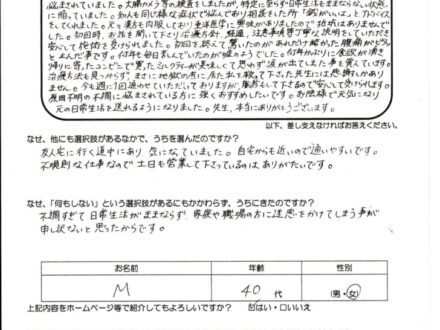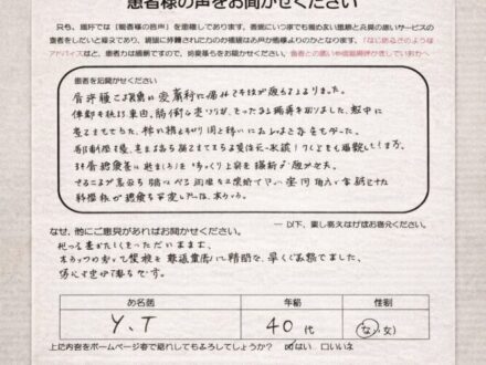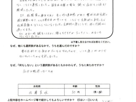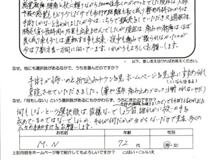 症状の一定の改善が達成された方にはこのご自宅でのケアと定期的なメンテナンス治療を行う事で、長く付き合うお体を恒久的にベストな状態に保つお手伝いを行います。
