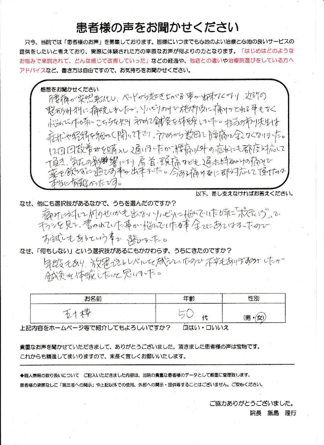 腰痛が突然悪化し、ベッドから起き上がることが出来なくなり、近所の整形外科に通院しましたが、リハビリのみで施術後に痛みが取れることもなく悩んでいた時にこちらを知り、初めて鍼灸を体験しました。担当の市川先生は症状や経緯を細かく聞いて下さり、初めから数回で腰痛は全くなくなりました。