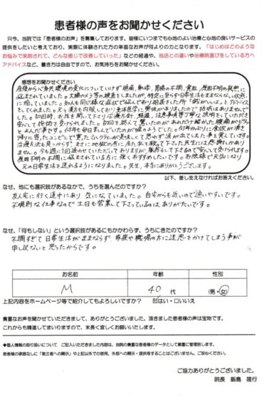 「原因不明の不調が回復し、元気に日常生活を送れるようになりました。」