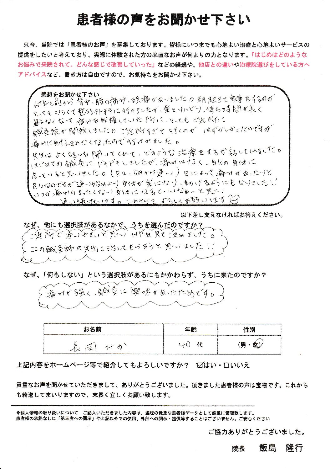 初めての鍼灸にドキドキしましたが、鍼治療は痛くなく、自分の体にあっていると思いました。(R2.5月から通い)
