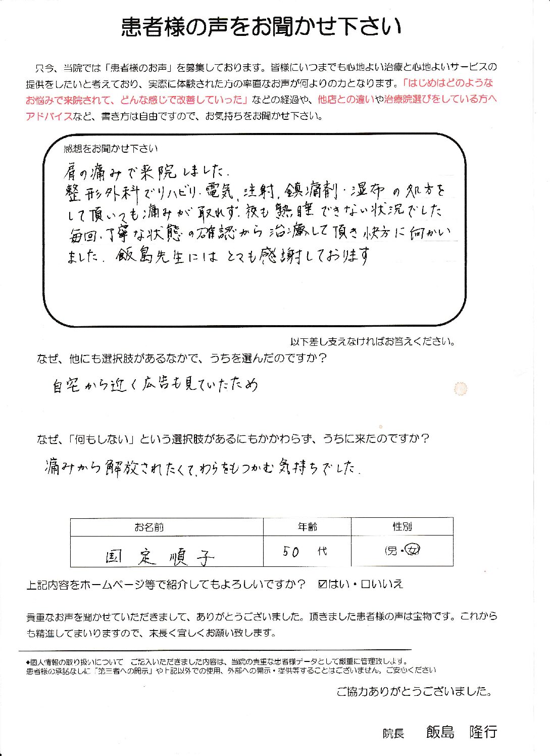 整形外科でできることは全てやりましたが肩の痛みが全く良くならず、①こちらの治療院が近所にある②知人が通院してここの鍼灸をおすすめしていた。