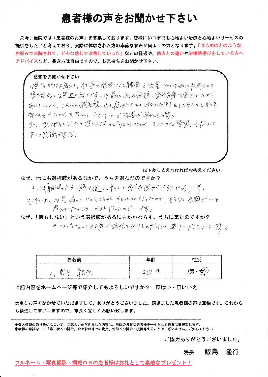 通院開始から2年ほど経ち、慢性的な肩こりや腰痛が悪化して仕事に支障をきたすことはなくなりました。鍼の刺激量や部位を調整してもらえるため改善が早く、足の冷えや眠りの浅さといった症状も軽減されています。患者さんの感想