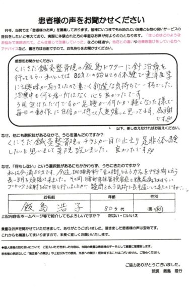 長い年月のあいだ、腰部脊柱管狭窄症と糖尿病をわずらい、ブロック注射を何十回と受けながら過ごしてきましたが、どこかに“疑問”のような気持ちを抱えたまま過ごしていました。そんな時に、くにさだ鍼灸整骨院さんのチラシが目にとまり、「これはぜひ体験してみたい」と思い来院しました。80才で初めての鍼治療でしたし、もともと東洋医学にも興味があったため、とても新鮮な気持ちで施術を受けることができました。