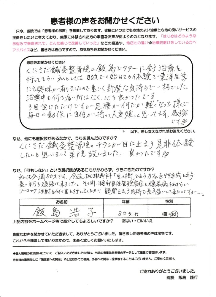 くにさだ鍼灸整骨院の飯島ドクターに針治療を行ってもらい私としては80才での初めての体験で東洋医学にも興味が有りましたので素ごく新鮮な気持ちで一杯でした。