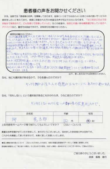 「初診時立ち上がれない程の腰の痛みが、一回治療後立てるようになり、三回治療後には元通り以上。これが神の手ですね。」