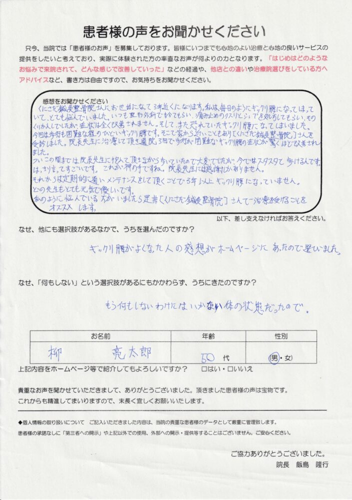 院長先生に治療して頂き通院3回で歩行が困難なギックリ腰の症状が驚くほど改善されました。