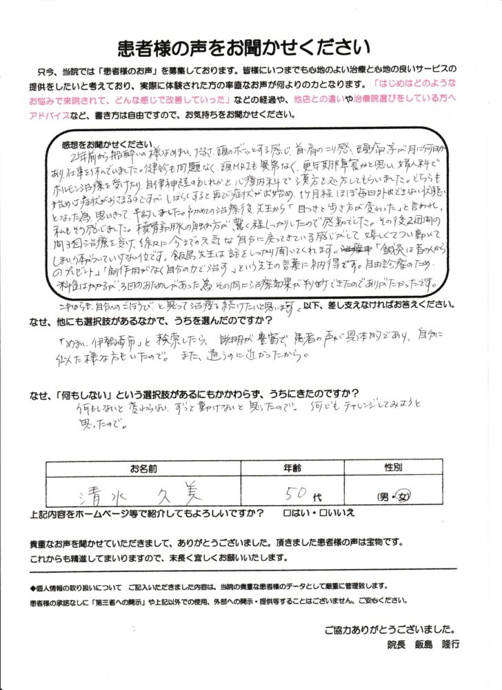 「めまい、だるさ、頭痛がすべて改善しました」二年前から船酔いのようなめまい、だるさ、頭のボーっとする感じ、首、肩のこり感、頭痛等が月に何日間かあり、仕事を休んでいました。検診も問題なく、頭MRIも異常なく、更年期障害かと思い、婦人科でホルモン治療も受けたり、自律神経の方かと、心療内科で漢方も処方してもらいました。どちらも初めは症状が治まるのですが、しばらくすると再び症状が出始め、一か月ほどほぼ毎日外出できないとなった為、思い切って、予約しました。初めての治療後、先生から「目つきと歩き方が変わった」と言われ、私もそう感じました。