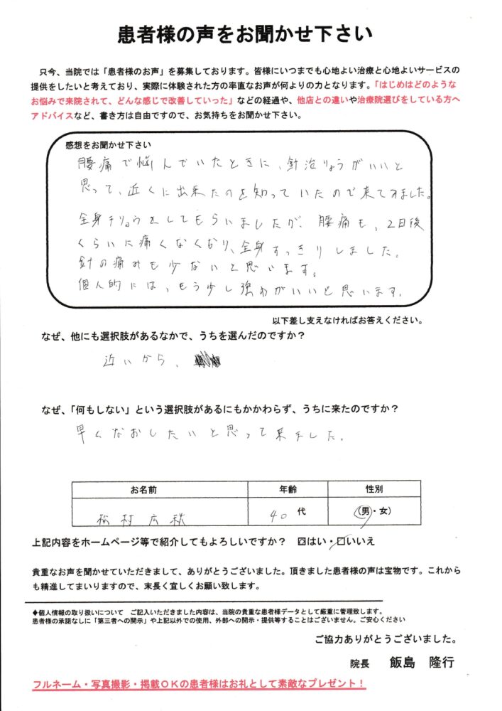 「全身すっきりしました」腰痛で悩んでいた時に鍼治療がいいと思ってくにさださんが近くにできたのを知っていたので来てみました。
