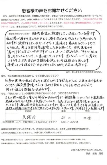 「日曜日も通えて安心です」田代先生に施術していただいている者です。私は若い頃から肩こりがひどく、横を向くのもやっとという感じだったのですが、施術をしていただいてからは、真後ろも見られるくらいまでになりました。