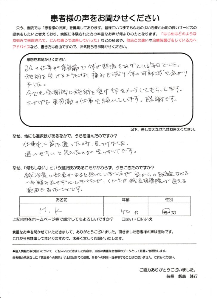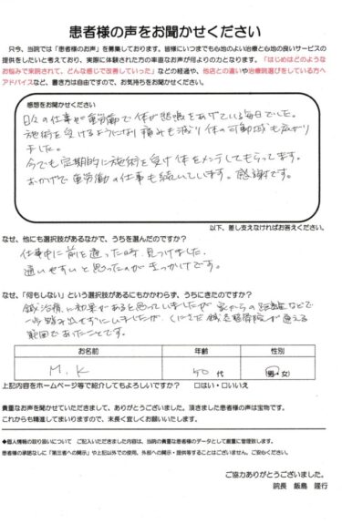 日々の仕事が重労働で、腰など体が悲鳴をあげている毎日でした。施術を受けるようになり痛みも減り、体の可動域も広がりました。今でも定期的に施術を受け体をメンテしてもらってます。