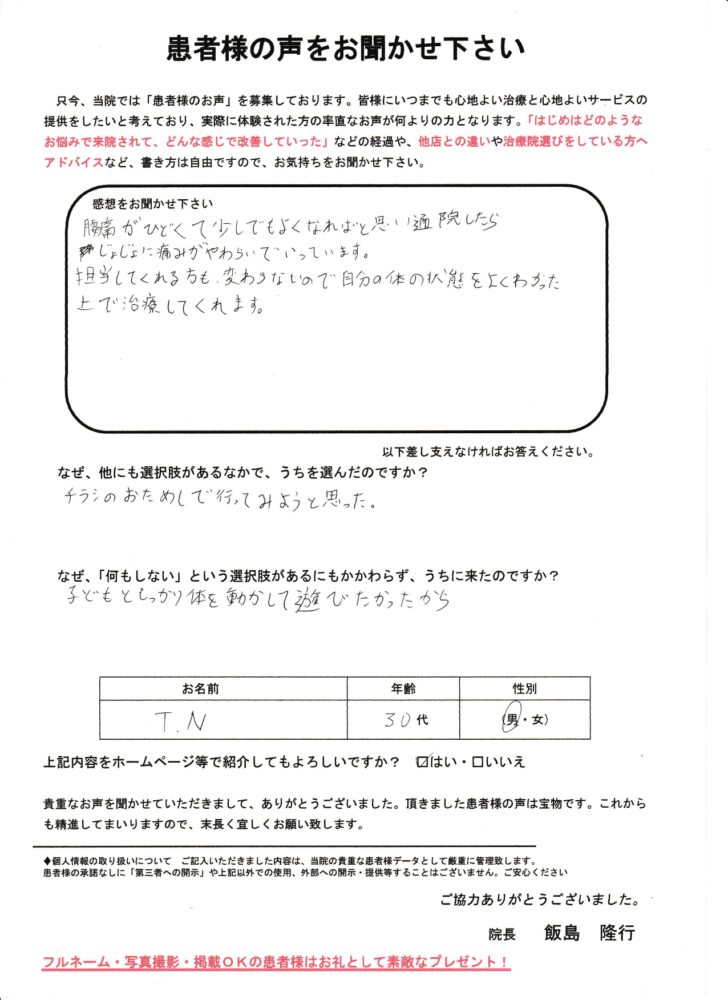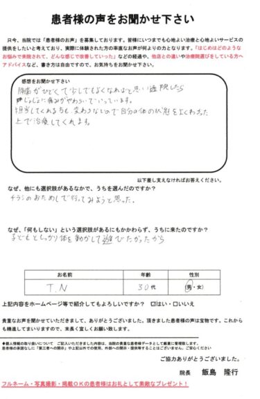 腰痛がひどく、朝の動作や子どもと体を動かす時間にも支障が出るようになっていました。「このままでは遊んであげることもできない」と不安が大きくなっていた頃、家に届いたチラシを見て、まずは試してみようと思い来院を決めました。院長からのコメント