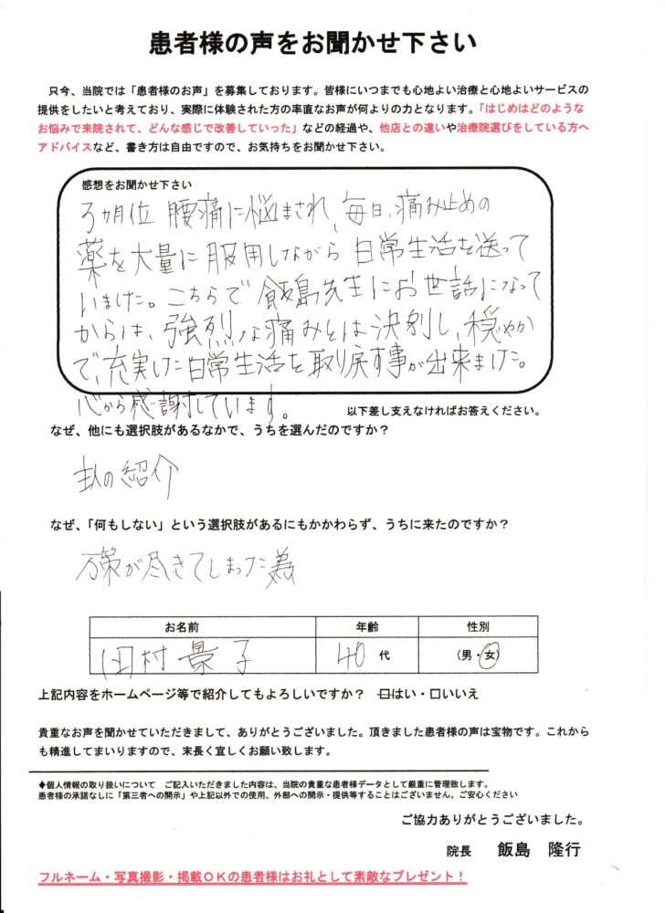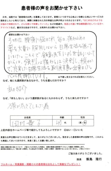 三か月位腰痛に悩まされ、痛み痺れに耐えながら毎日痛み止めの薬を大量に服用しながら日常生活を送っていました。こちらで飯島先生にお世話になってからは、強烈な痛みとは決別し、穏やかで充実した日常生活を取り戻す事ができました。