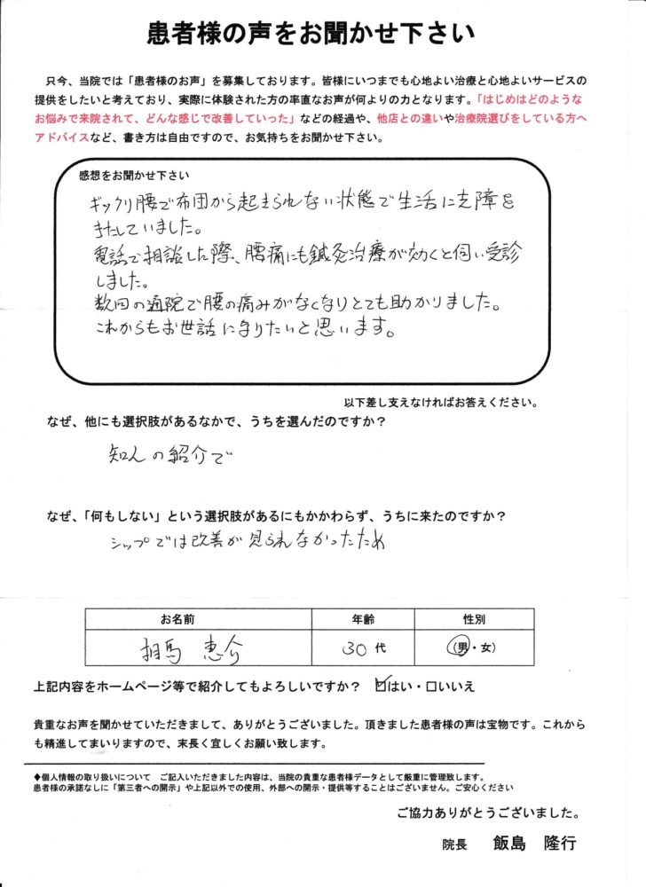 腰痛にも鍼灸はとても効果があるということを教えて頂き早速受診しました。