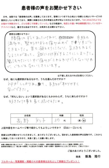 初回施術後から腰の重だるさが軽減。数回の通院で首肩のこわばりが和らぎ、吐き気も軽減。