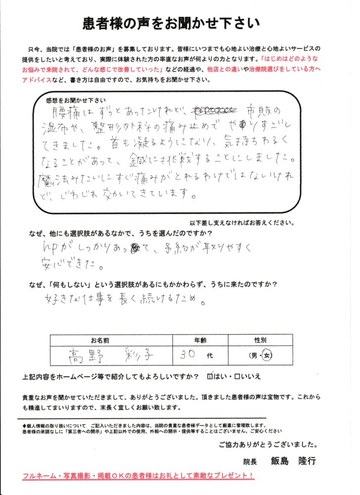 首こり、腰痛の鍼灸による改善体験談「薬に頼らない治療を探していました」