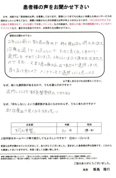 「首と肩の痛みがひどくて通院しました。2年くらい前に首と肩の痛みで夜も眠れない日が続き、頭痛や不眠も重なって、仕事にまで支障が出てきてしまいました。『これはまずい』と思い、くにさだ鍼灸院さんの治療を受けることにしました。