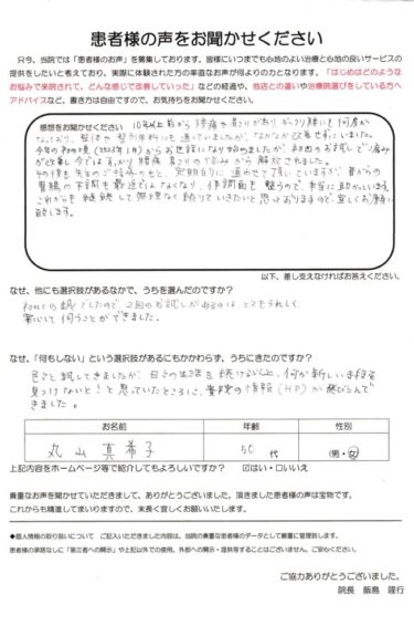 「慢性的な肩こり、腰痛から解放されました」