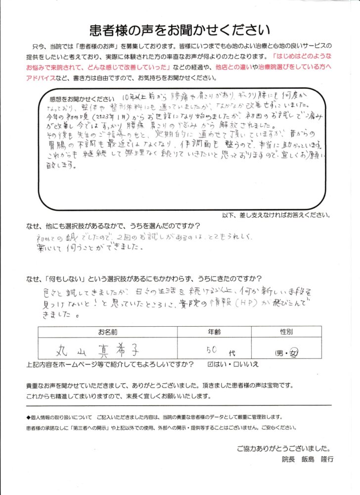 今年の初め頃(2023年1月)からお世話になり始めました。慢性的な腰痛と肩こりにずっと悩まされていて、どこで治療してもなかなか良くならず困っていました。そんな中、こちらを知り、まずは施術を受けてみることにしました。院長からのコメント