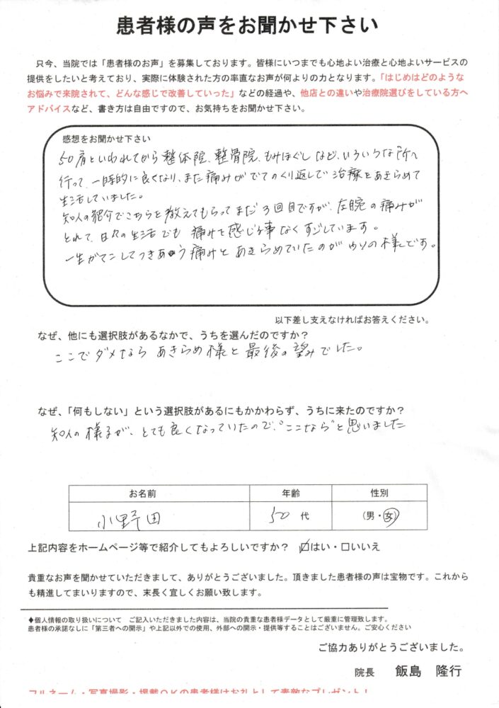 「ここでダメなら諦めようと最後の望みでした」50肩と言われてから整体院、整骨院、もみほぐしなどいろいろなところへ行って一時的に良くなり、また痛みが出ての繰り返しで改善を諦めて生活していました。