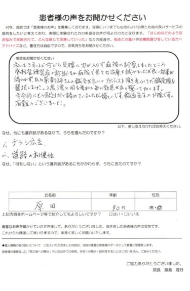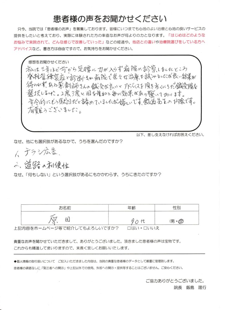 「年齢的にあきらめていました」私は三年ほど前から足腰に力が入らず、病院で診察してもらったところ、脊柱管狭窄症と診断されました。