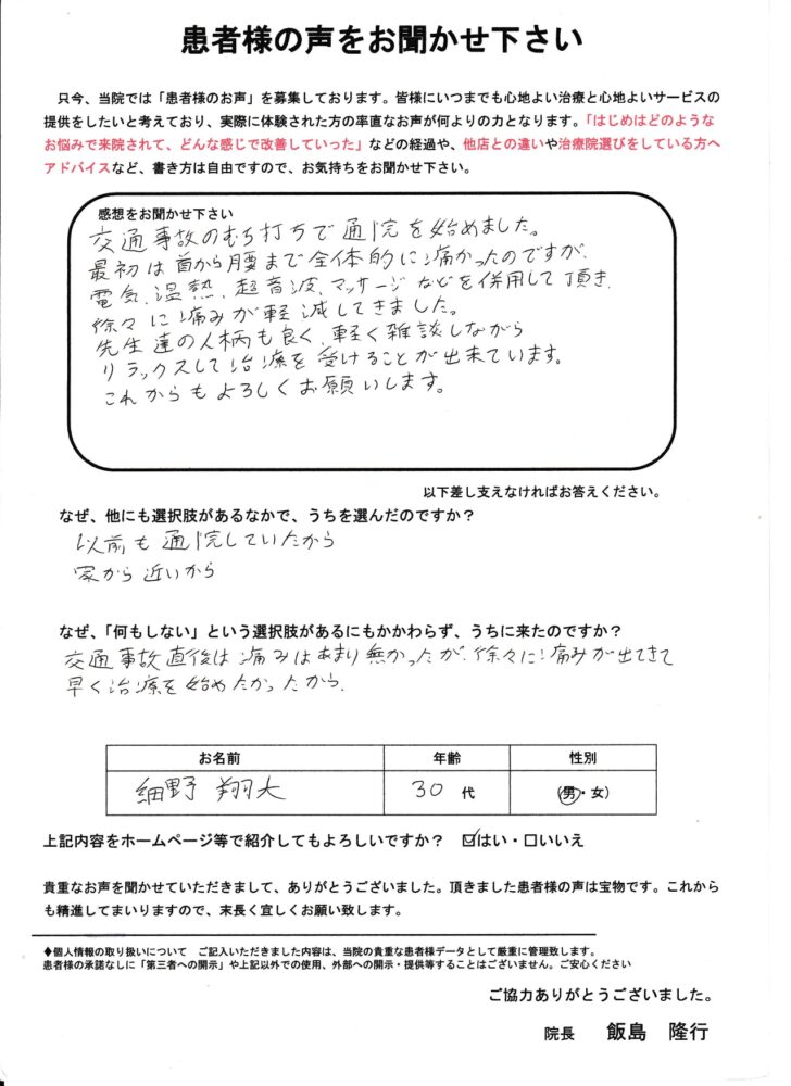 「交通事故の治療で転院して鍼灸をお願いしました。」