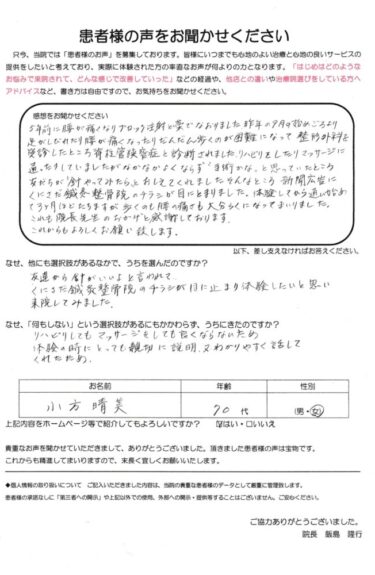 リハビリをしたり、マッサージに通ったりしていましたが、なかなか良くならず「手術かな」と思っていたところ友達が「鍼やってみたら」と教えてくれました。