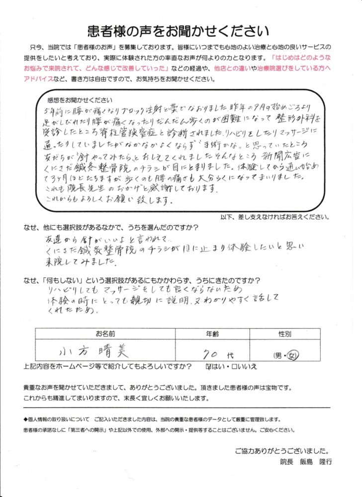 「歩くのがとても楽になりました」15年前に腰が痛くなりブロック注射と薬で治りました。昨年の9月の始めごろより足がしびれたり腰が痛くなったり、だんだん歩くのが困難になって整形外科を受診したところ脊柱管狭窄症と診断されました。