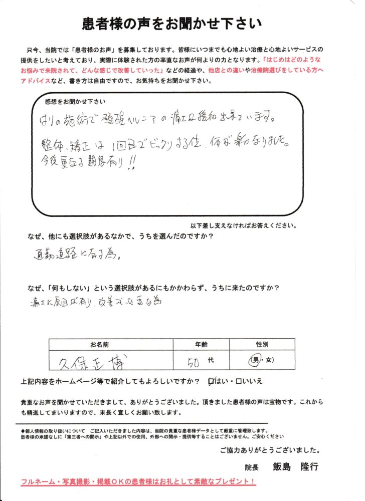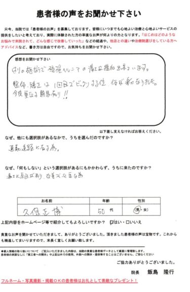 腰の方は一回目でびっくりするくらい体が楽になりました、これからもよろしくお願い致します。