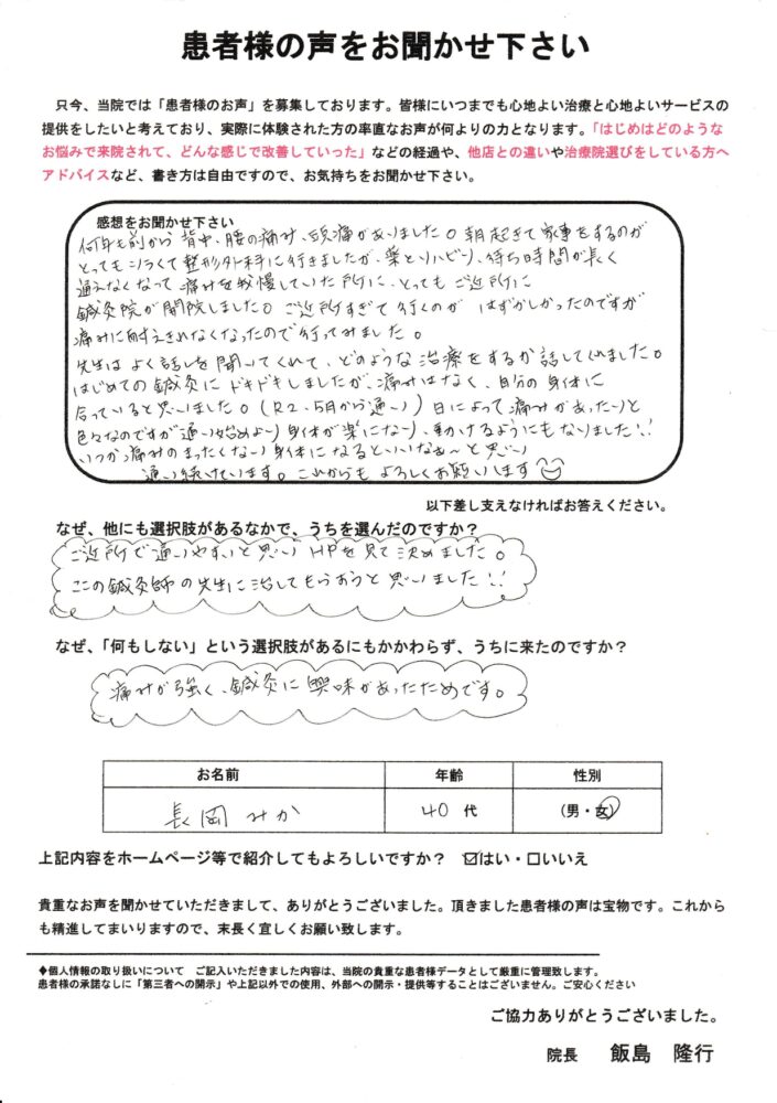 くにさだ鍼灸院の近くに住んでいたこともあり、長年腰痛を始めとしたコリの症状、自律神経の乱れによる不眠に悩んでいたところ、鍼灸治療の可能性を調べてこちらを受診する事にしました。鍼灸は未経験だったので躊躇しましたが受けてよかったと思います。