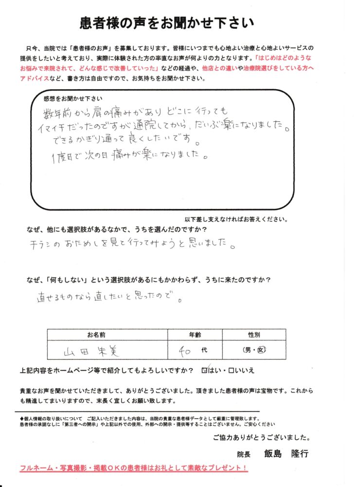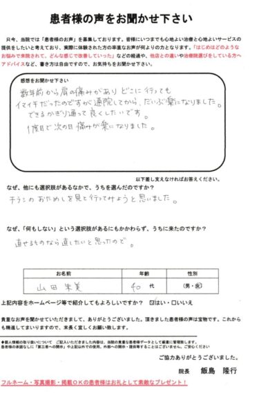 数年前からの痛みも楽になります。数年前から肩の痛みがありどこに行ってもイマイチだったのですが、治せるものなら治したいと思っていたところ「くにさだ鍼灸整骨院」さんのチラシを見て行ってみようと思いました。