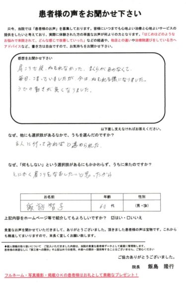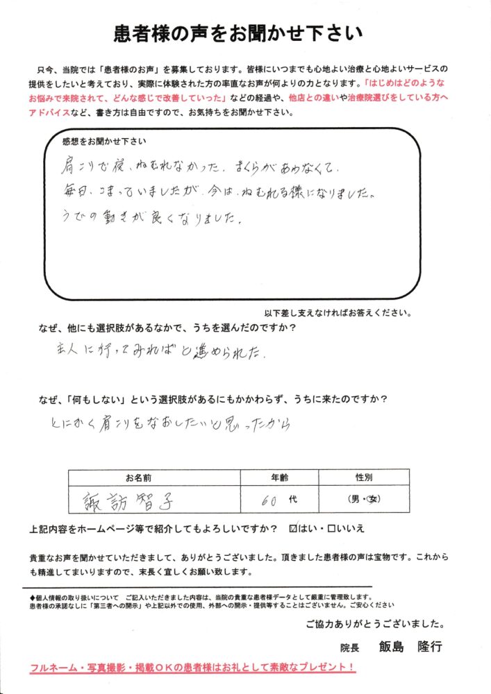 夜も眠れないほどの慢性的な肩こりがスッキリしてしっかり眠れるようになりました。