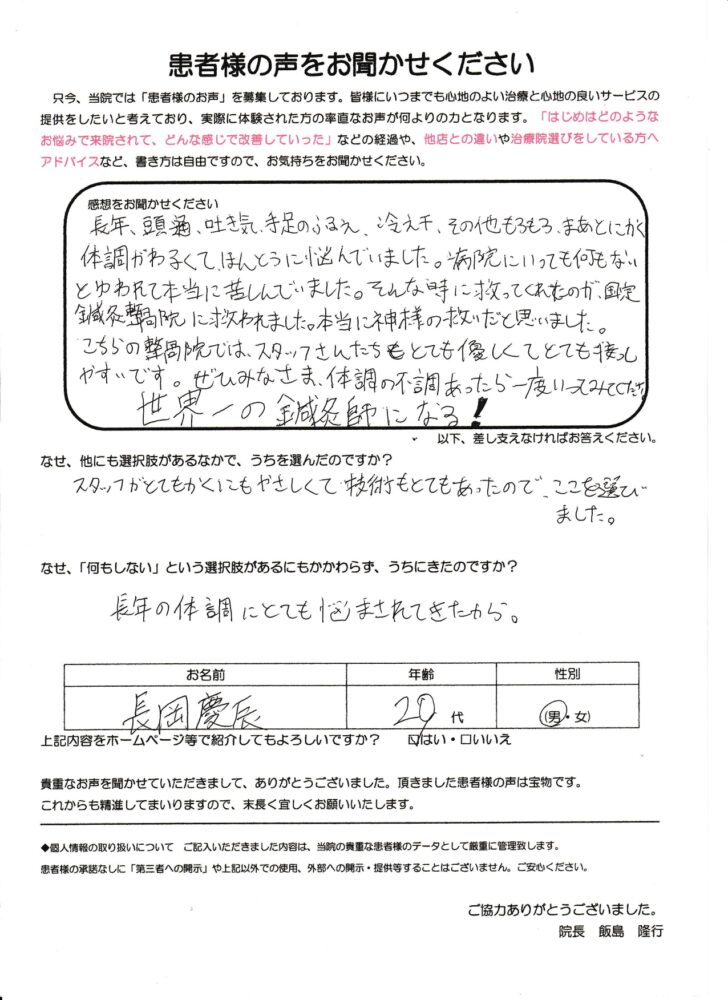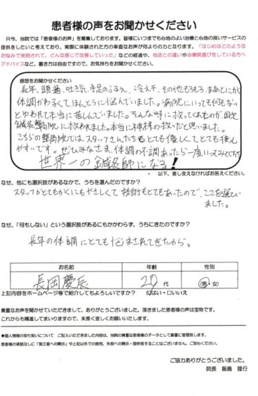 初めは不安がありましたが、スタッフが親切に対応し安心して施術を受けることができました。治療を重ねるうちに頭痛や吐き気などの症状が軽減し、気持ちも前向きになられています。患者さんの感想