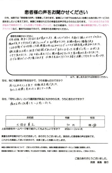 3回、4回と施術を重ねるうちに腰と膝の痛みが改善し、夜間痛も軽減。現在は夜中に何度も起きることがなくなり、朝までぐっすり眠れるようになりました。患者さんの感想