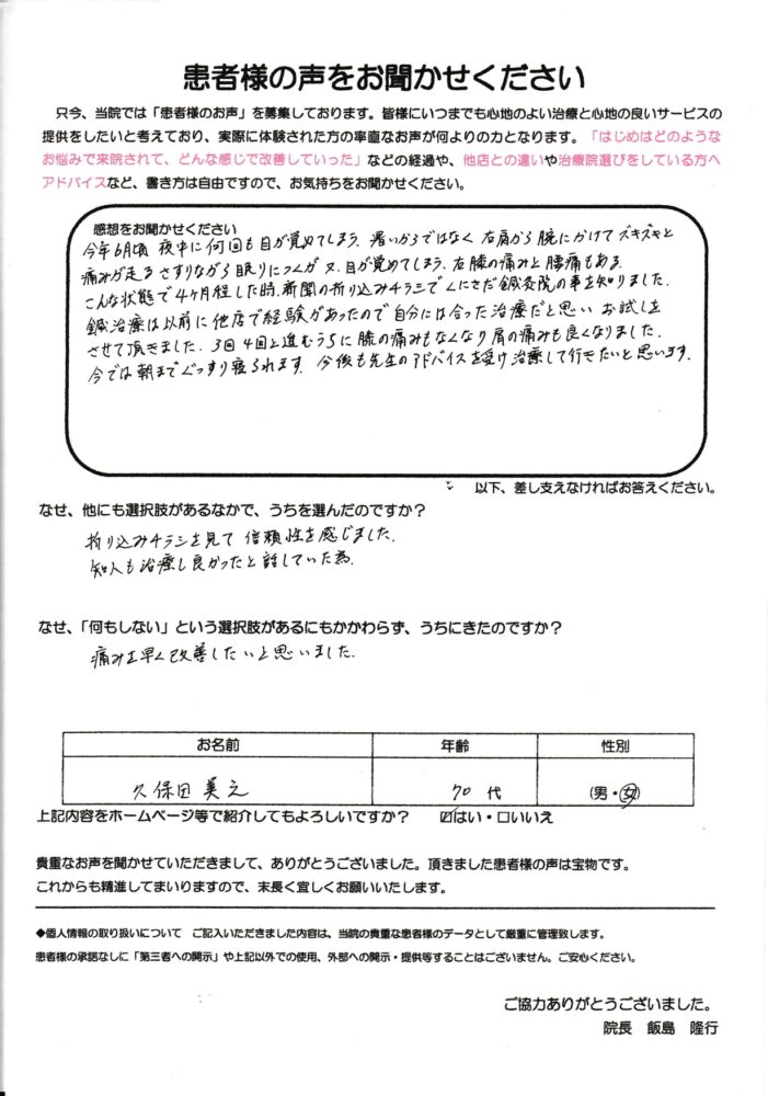 今では朝までぐっすり寝られます今年六月頃、夜中に何度も目が覚めてしまう。暑いからではなく右肩から腕にかけてズキズキと痛みが走る。さすりながら眠りにつくが、また目が覚めてしまう。右膝の痛みと腰痛もある。こんな状態で四か月ほど経った時、新聞の折込チラシでくにさだ鍼灸院の事を知りました。鍼治療は以前に他店で経験があったので自分には合った治療だと思いお試しをさせて頂きました。