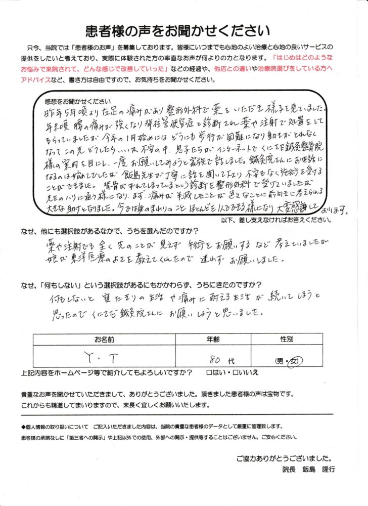 昨年の5月ごろから左足に痛みがあり、整形外科で薬をいただき様子を見ていました。年末には腰の痛みが強くなり、脊柱管狭窄症と診断され、薬や注射で処置をしてもらっていましたが、今年の1月初めには歩行が困難になってしまい、この先どうしたらよいか不安の中、息子たちがインターネットでくにさだ鍼灸整骨院を見つけて、一度お願いしてみようと家族で話しました。院長からのコメント